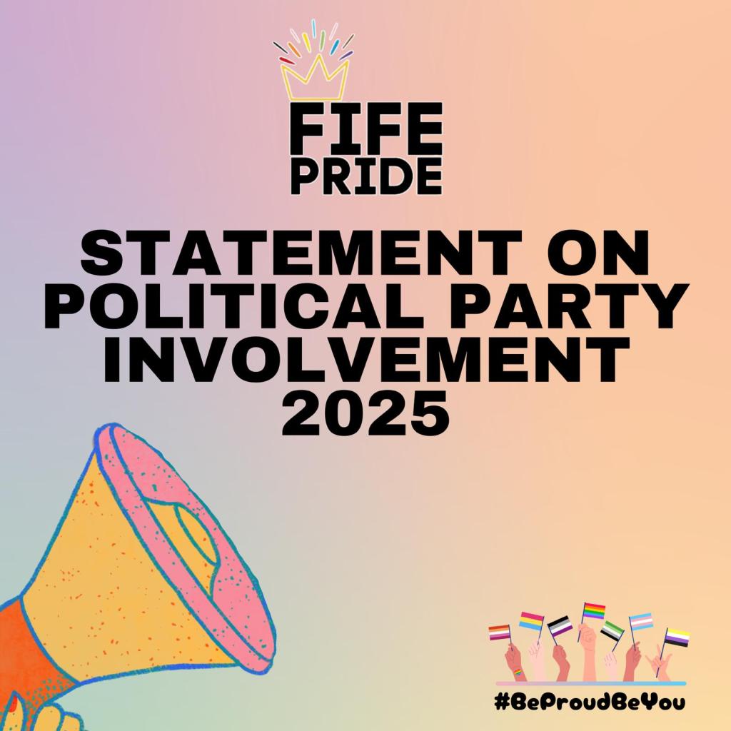 Following thoughtful reflection, we have made the decision that political parties will not be permitted to participate as organised groups or host stalls at Fife Pride 2025. This also includes the distribution of materials that promote any political party or agenda.