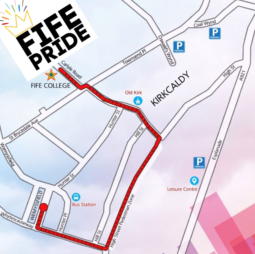 The day began at 12:30pm as people gathered at Fife College, St Brycedale Campus to prepare for the Pride Parade. Stepping off at 1:00pm, the parade travelled down Kirk Wynd, along the High Street, and up Whytescauseway, finishing at the Town House in Kirkcaldy Town Square — the heart of the festival.